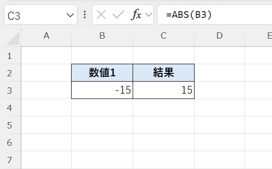 ABS関数はマイナスの値をプラスに変換するため、「-15」は「15」として返されます。