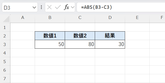 セルB3に「50」、セルC3に「80」が入力されている場合、差を求めて絶対値にするには次のように入力します。