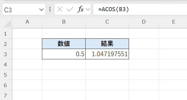 ACOS関数は、コサイン値から角度(逆余弦)を求められる関数で、結果はラジアンで返されます。