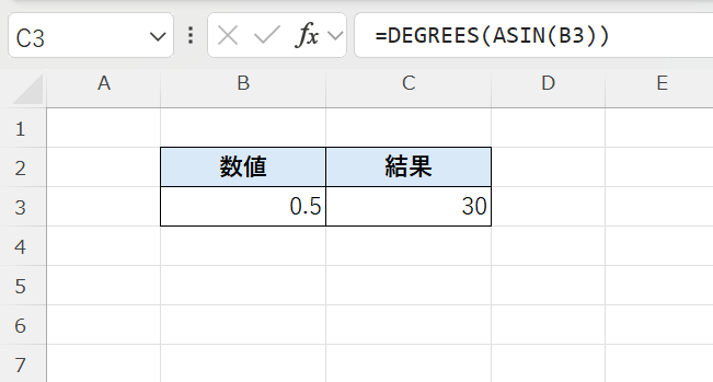 角度(度数法)で表示したい場合は、DEGREES関数を組み合わせることで「30度」として表示できます。