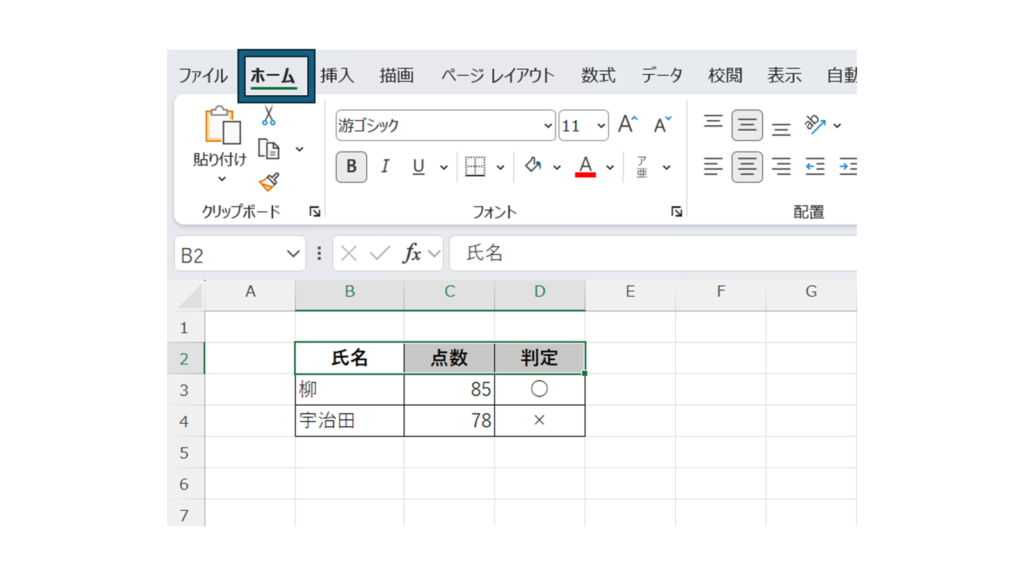 Excel上部のリボンにある「ホーム」タブをクリックします。セルの書式設定に関する操作は、このタブから行うことができます。