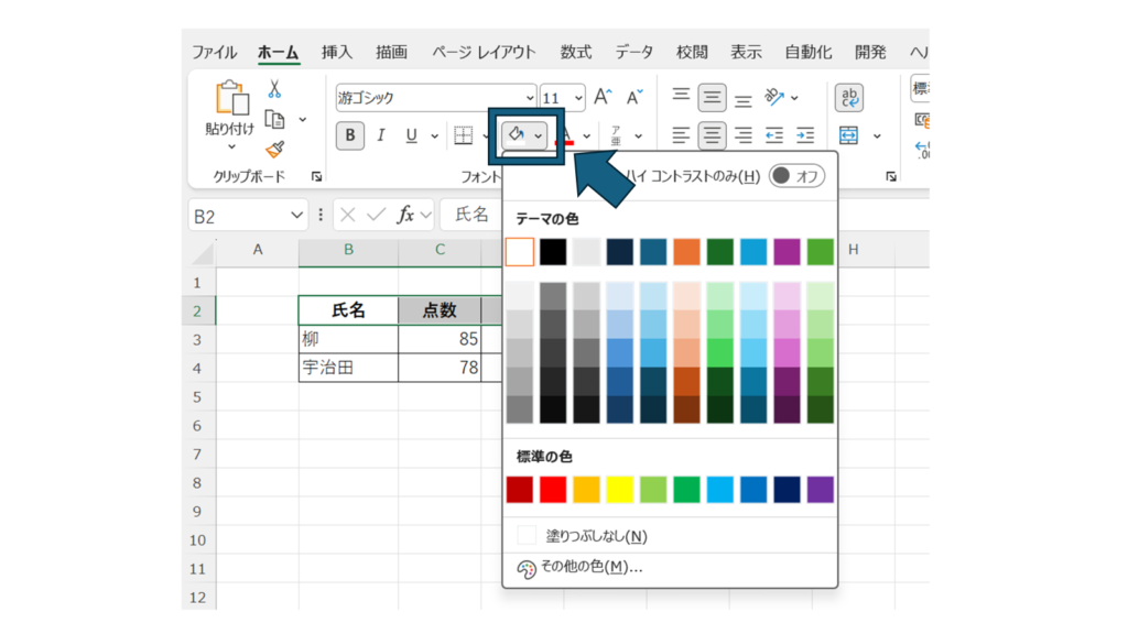 「フォント」グループにある 塗りつぶしの色(バケツのアイコン) をクリックします。
