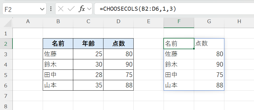 CHOOSECOLS関数は、必要な列だけを抽出して別の表を作るときに便利です。