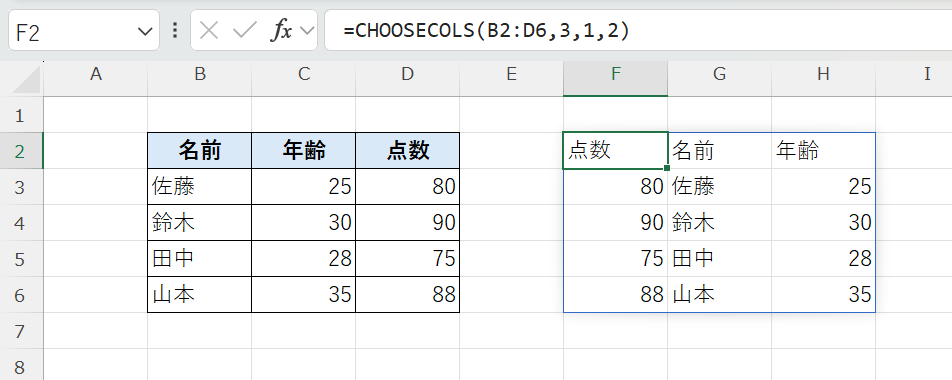 CHOOSECOLS関数は、指定した順番どおりに列を並べるため、元の並びに関係なく自由に列の順番を変更できます。
