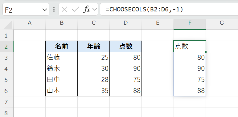 この式では「-1」を指定しているため、範囲の一番右の列(最後の列)が抽出されます。