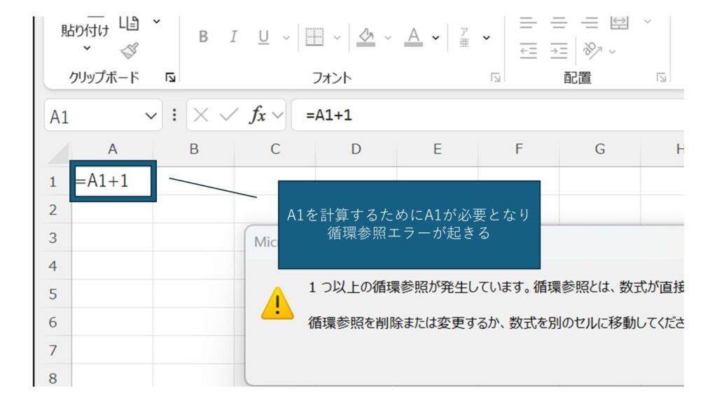 この式を セルA1 に入力してしまうと、A1は自分自身(A1)を含む計算を行うことになり、「A1を計算するためにA1が必要」という無限ループ状態になってしまうのです。