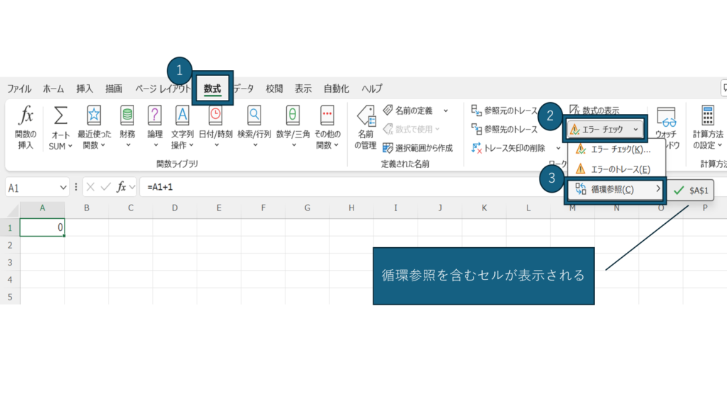もし複雑なシートで原因が分からない場合は、「数式」タブの 循環参照ツール を使うと該当セルを特定できます。