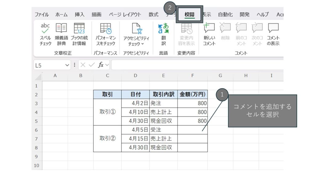 まず、コメントを追加したいセルを選択します。