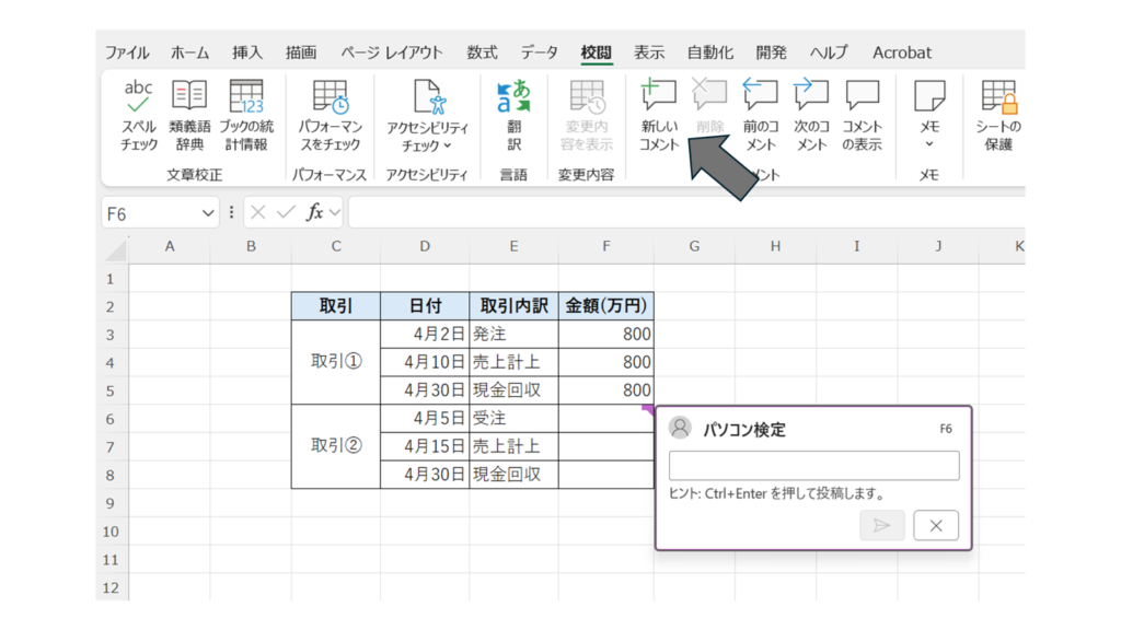 「校閲」タブの中にある「新しいコメント」をクリックします。