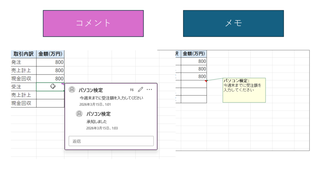 なお、Excelには似た機能として「メモ」がありますが、メモは補足説明を書くだけの機能で、コメントのように返信や会話はできません。