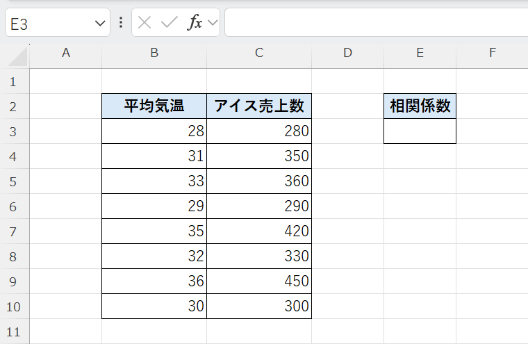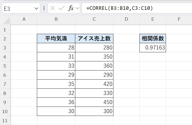 両者の間にどの程度の相関関係があるのかを、CORREL関数を使って確認します。