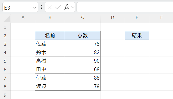 「テストの点数が80点以上の生徒数」をCOUNTIF関数で求めてみましょう。