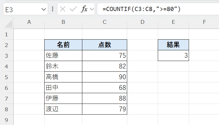 この数式では、C列(点数) の中で 80点以上の生徒が何人いるか をカウントしています。
