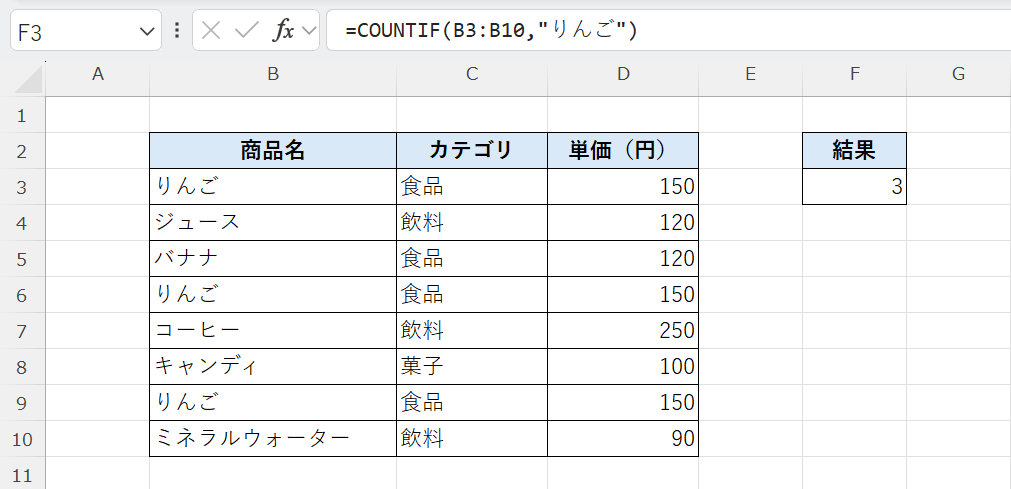 COUNTIF関数は、指定した範囲の中で条件に一致するセルの個数を数える関数です。