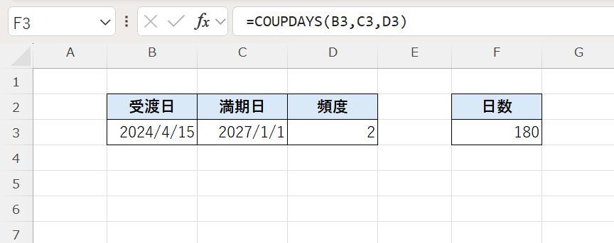 =COUPDAYS(受渡日, 満期日, 頻度, [基準])