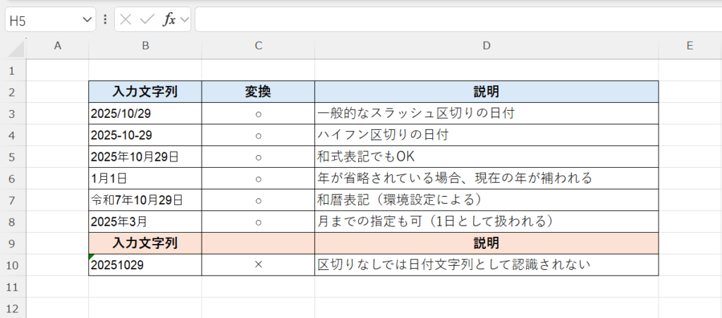 ここでは、DATEVALUE関数で正しく認識される日付文字列の代表的な例を紹介します。
