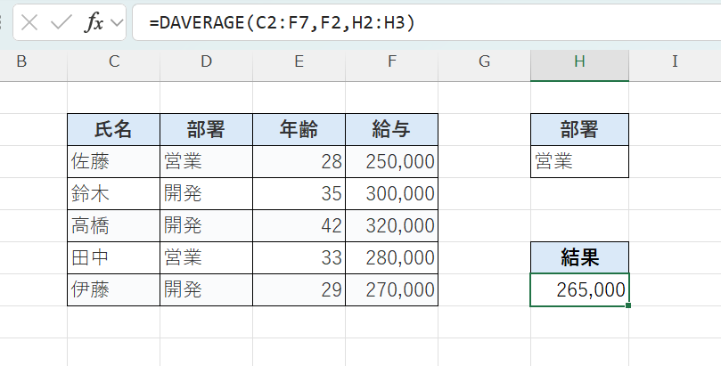 DAVERAGE関数は、データベース形式の表から「条件を満たすレコードの平均」を計算する関数です。