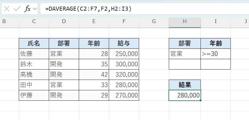 → 「部署が営業 かつ 30歳以上」の条件に一致するのは「田中」さんのみ、結果は 280000。