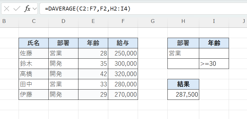→ 「部署が営業 または 30歳以上」の条件に一致するのは「伊藤」さん以外の全員で、結果は 287500。
