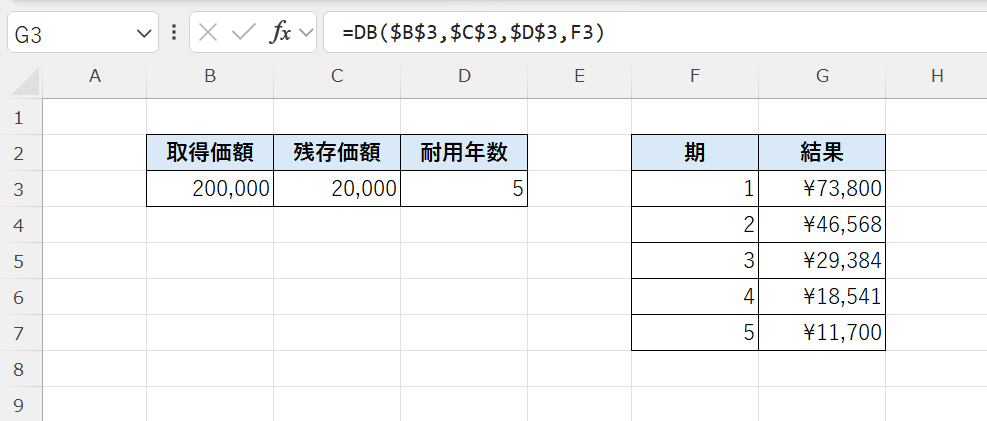 DB関数は、取得価額・残存価額・耐用年数をもとに、各期間ごとの減価償却費(定率法)を求める関数です。