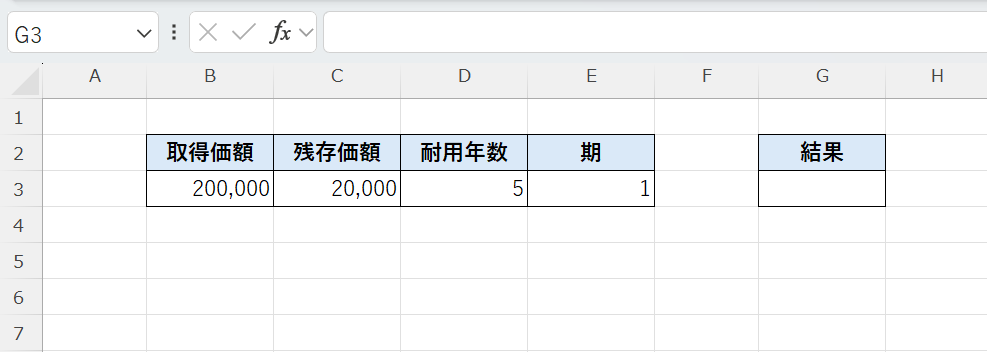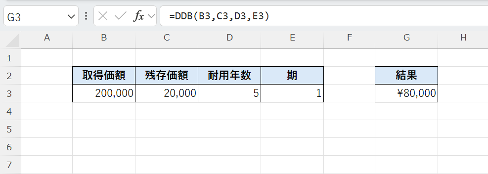 DDB関数は、取得価額・残存価額・耐用年数をもとに、倍額定率法で減価償却費を求める関数です。