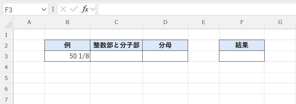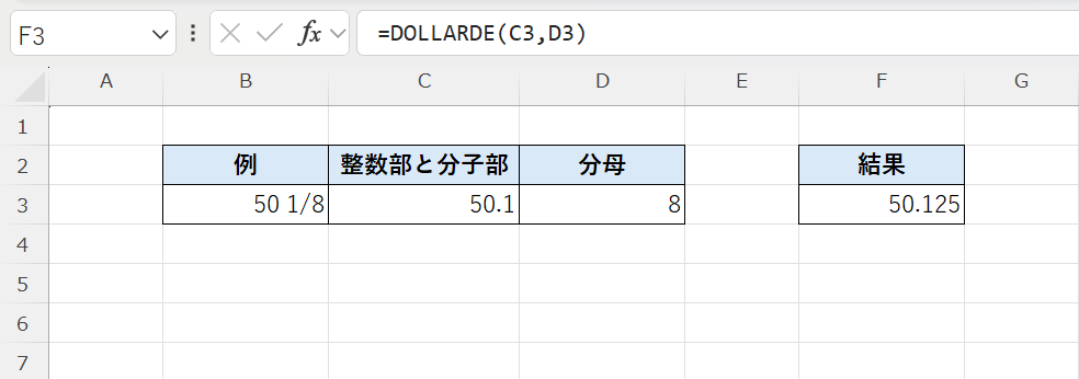 「50 1/8」をDOLLARDE関数を使い、小数表記に変えていきます。