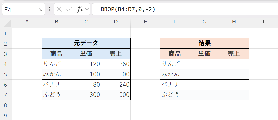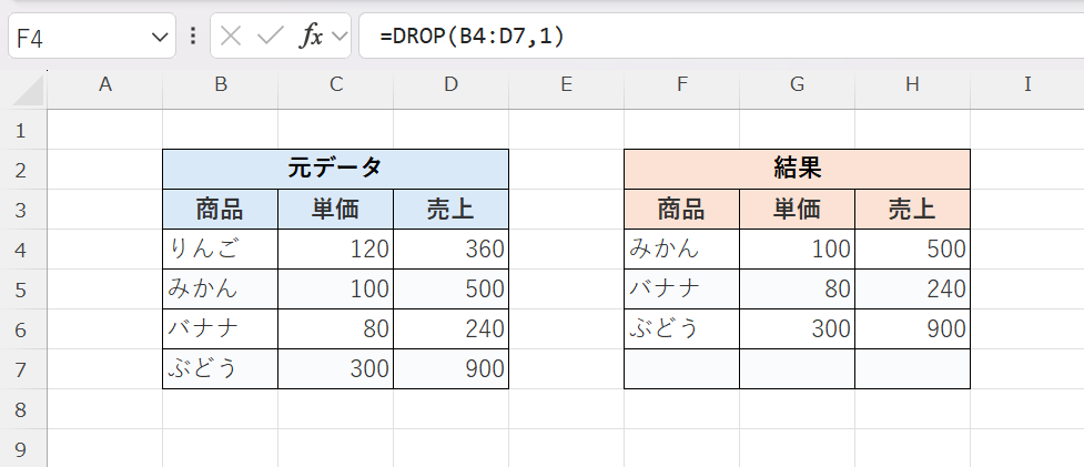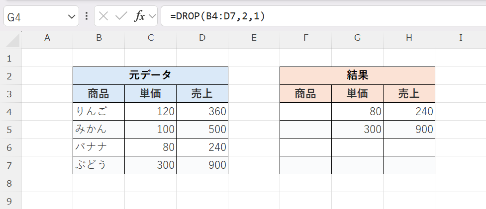 DROP関数では、指定した行数や列数を取り除いた“残りの範囲”をそのまま新しい配列として返します。