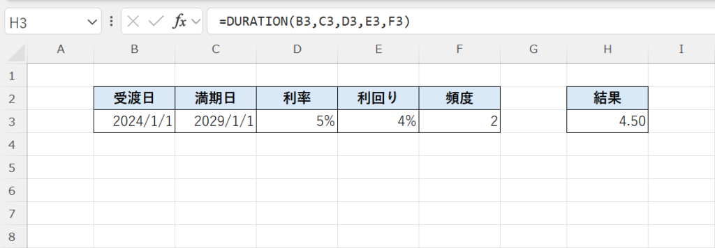 DURATION関数の結果「約4.5」は、この債券の平均回収期間が約4.5年であることを意味します。