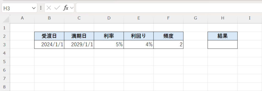 • 頻度:1年間の利息支払回数を指定します。(1 = 年1回, 2 = 年2回, 4 = 年4回)