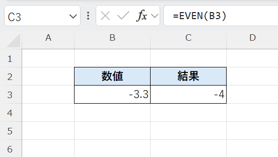 EVEN関数は負の数でも、偶数方向へ切り上げます。