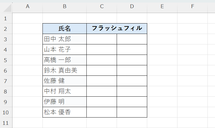 同様に、名前の列も分けたい場合は、D3に「太郎」と入力して「Ctrl + E」を押します。