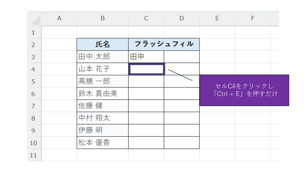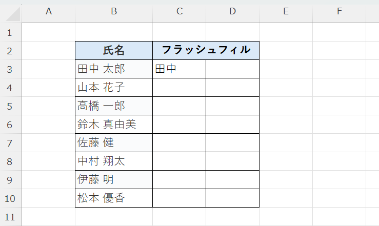 ここではセルB3の「田中 太郎」に対して、セルC3に「田中」と入力します。