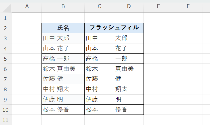 フラッシュフィルは、データの規則性(パターン)を自動で認識してくれるのが特徴です。姓と名の境目を判断し、同じ形式で残りのセルを一括変換します。