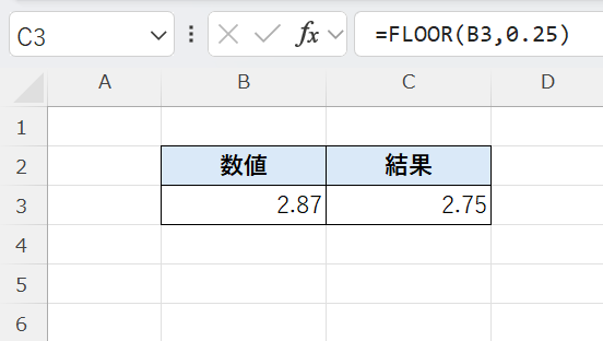 0.25 の刻み(2.50 / 2.75 / 3.00 …)のうち、「2.87」より下側にある値へ丸めます。