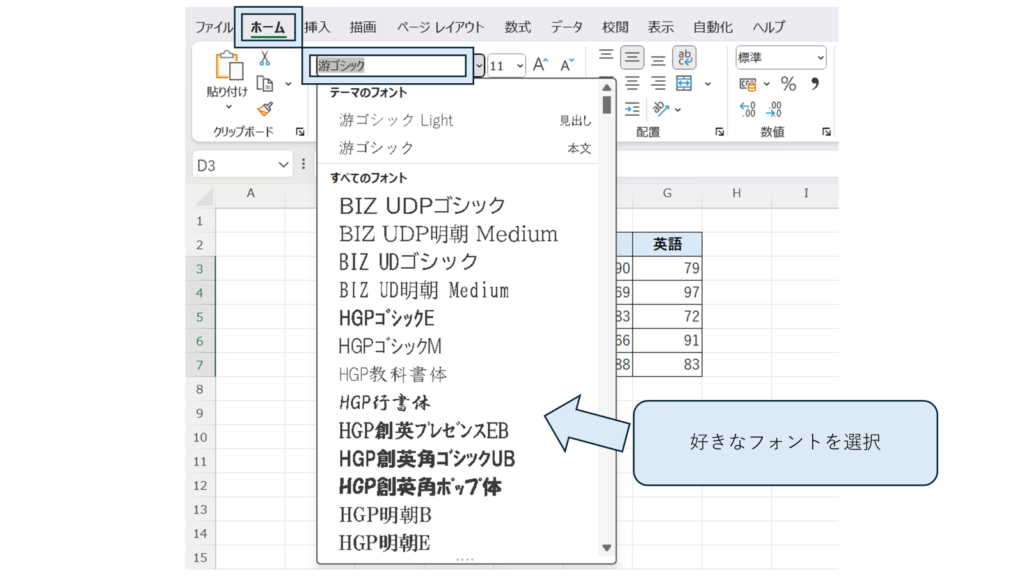「フォント」グループ内のフォント名ボックスをクリック → 一覧から好きなフォントを選択