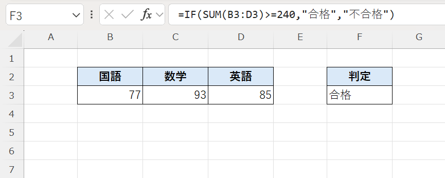 この条件は正しいため、IF関数は条件を満たした場合の結果として「合格」を表示します。