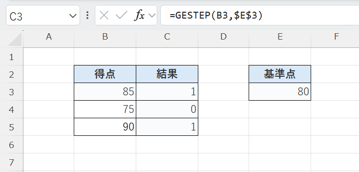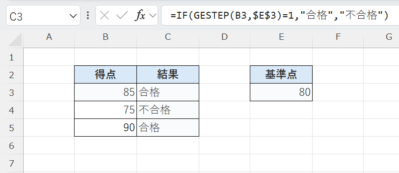 この例では 80点以上なら1(合格)、それ以外は0(不合格)と判定します。IF関数と同じ意味になりますが、GESTEP関数ならより短い式で書けます。