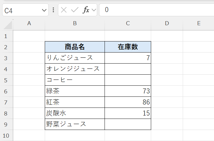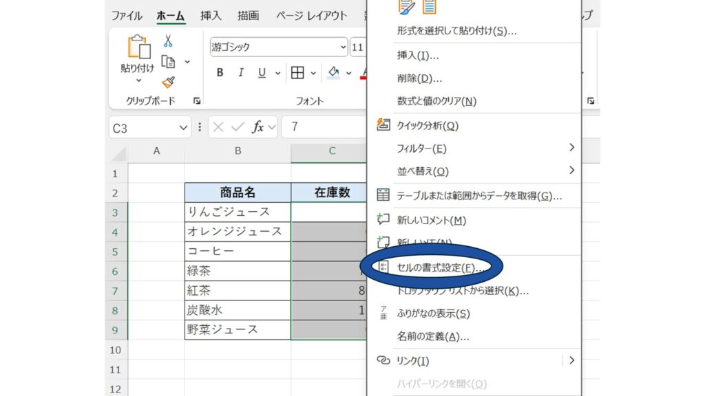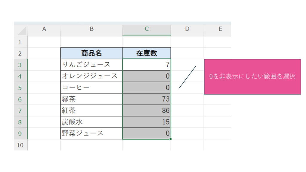 在庫数が入力されている範囲(C3:C9など)をドラッグして選択します。