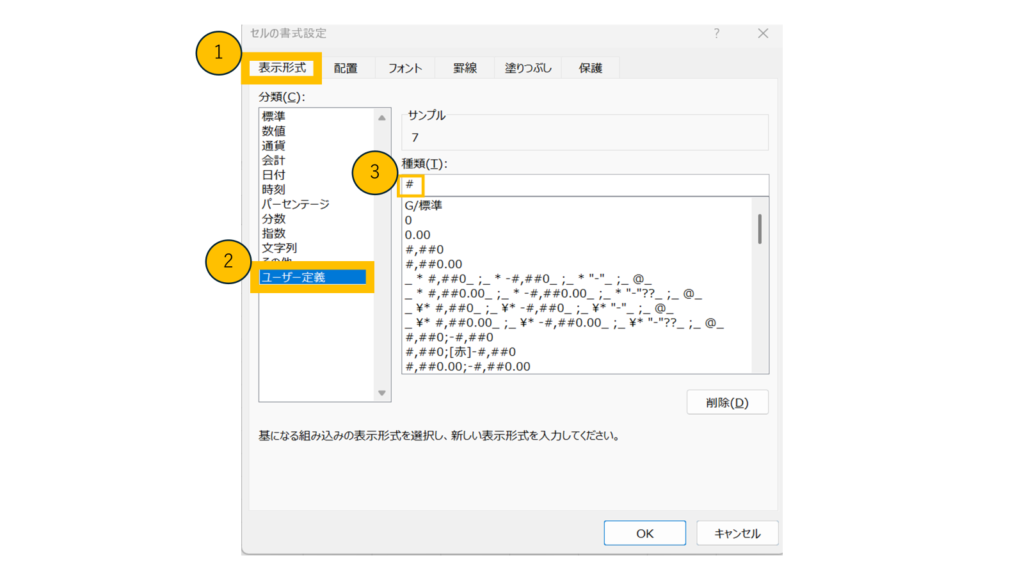 ③ 「ユーザー定義」を選択し、「種類」に # と入力