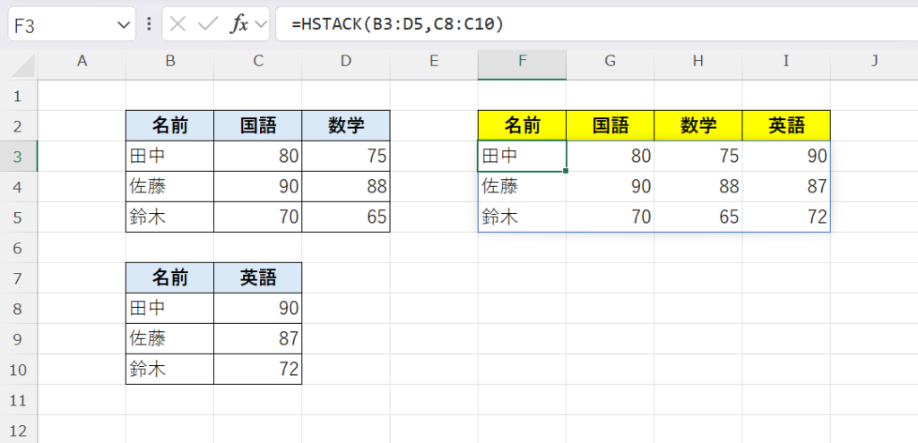 この例では、HSTACK関数を使って、既存の成績データに英語の点数を横方向に追加しています。