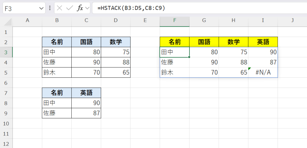 HSTACK関数は、指定した範囲のうち最も行数が多い配列に合わせて結果を返すため、行が足りない部分には #N/A が表示されます。