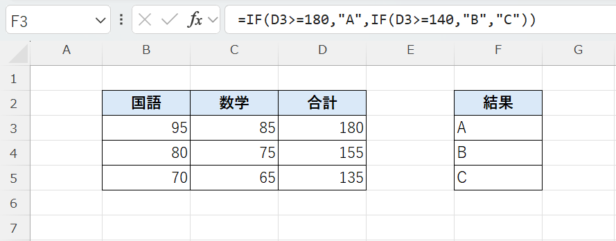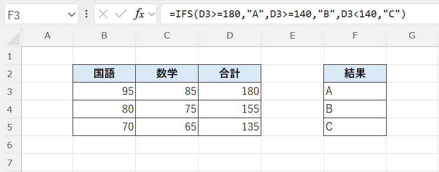 👉 180未満だが140以上なので「B」 - 3行目(国語70点+数学65点=135点)