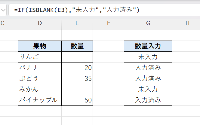 =IF(ISBLANK(E3), "未入力", "入力済み")