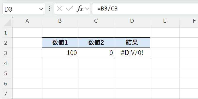 この式では「100 ÷ 0」の計算が行われますが、0で割ることはできないためエラーになります。