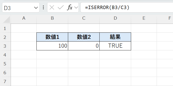 ISERROR関数は、指定した式やセルが何らかのエラーであればTRUEを返し、そうでなければFALSEを返す関数です。