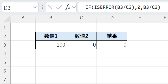 この式では、まずISERROR関数でエラーの有無を判定し、エラーであれば「0」を表示し、エラーでなければ計算結果を表示するようにしています。