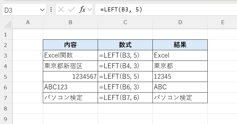 LEFT関数は、文字列の先頭(左側)から指定した文字数分を取り出す関数です。