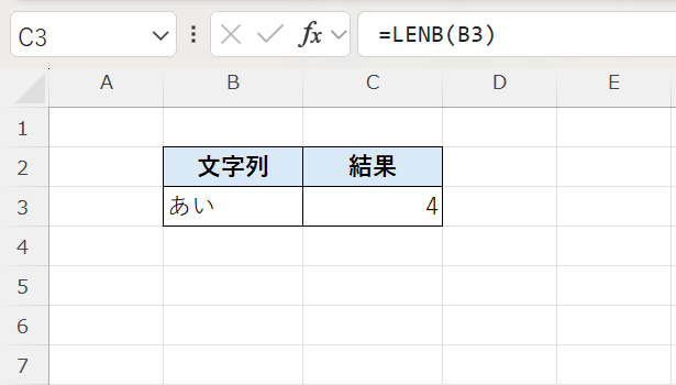 =LENB("あい") → 結果:4(あ=2バイト、い=2バイト)