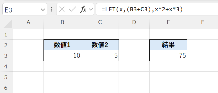 =LET(名前1, 値1, [名前2, 値2], …, 計算式)