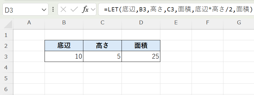 =LET(底辺,C3,高さ,D3,面積,底辺*高さ/2,面積)
